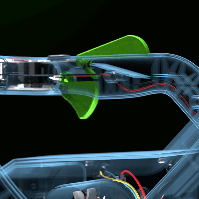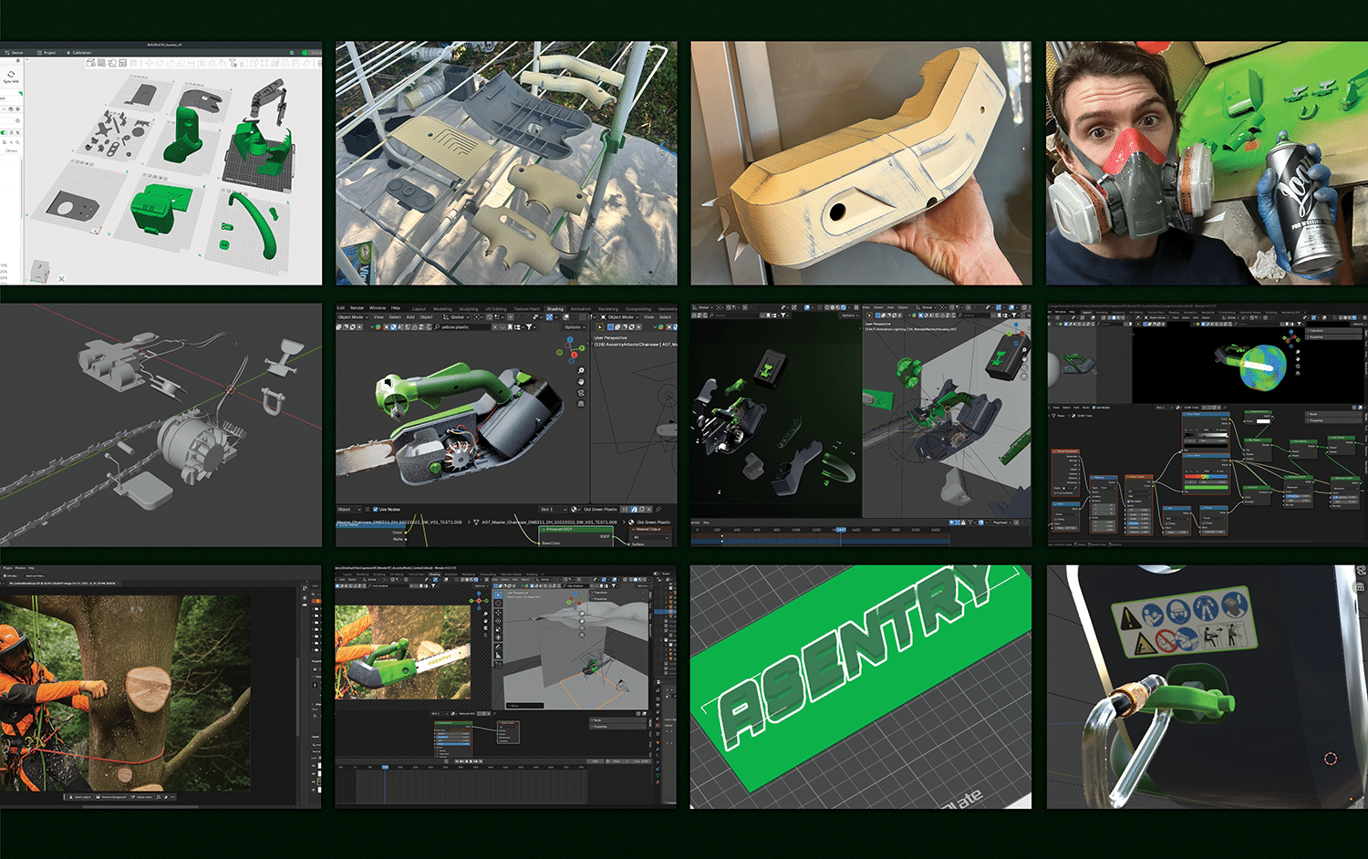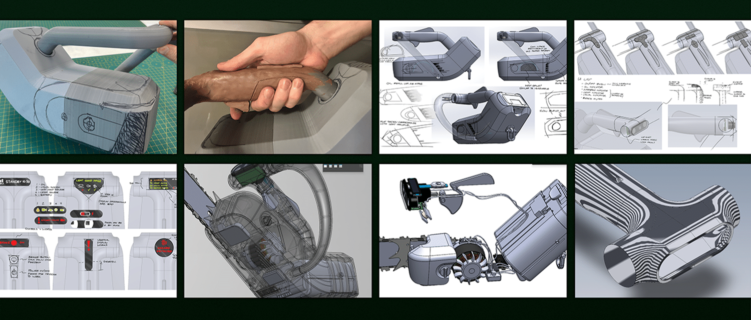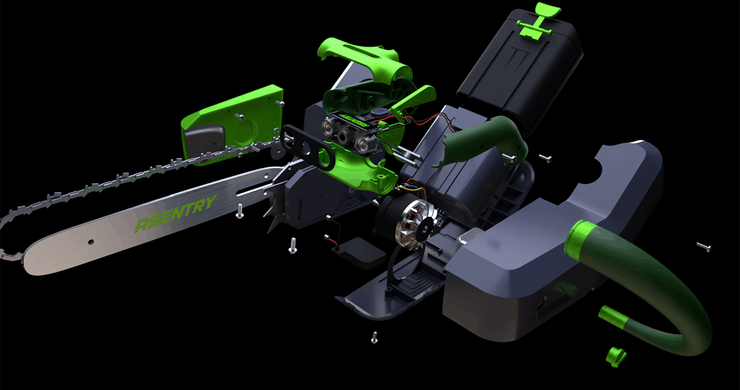 I used a hybrid top-down and bottom-up approach to create ASENTRY. The BLDC motor, drive sprocket assembly, trigger assembly, and STIHL AP300s battery system set some important constraints which the monolithic form was built around. After I had laid out these parts, I prioritised aesthetics and refined the minimalist design language with surfacing features in Solidworks. A full-scale prototype, and sacrificial marketplace chainsaw were really useful in helping me judge proportions in this phase. I then worked smaller internal components into the gaps. Ergonomic features demanded more extensive physical prototyping. I used modelling clay and a series of 3d printed handle variants to refine these features. Design for manufacture was considered throughout the entire design process, as maintenance is important to chainsaw safety- demanding a thoughtful approach to design for disassembly. Crowning and ribs strengthen the shell components, which are made from 3mm thick ABS. My Solidworks assembly contains 73 parts in total.