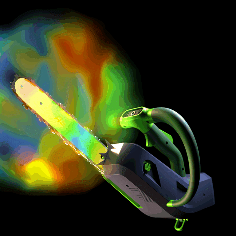 The physical prototype accurately depicts the form and weight (5kg) of the product. The prototype is made primarily from PLA, but utilises a real chainsaw bar and blade. Post processing of parts involved using automotive primer filler and loop spray paints. It utilises some real fastening features, adapted in some places to suit 3D print tolerances. 6Gx12mm screws support fastenings, and the 10mm flange nut on the sprocket cover reflects real chainsaw assembly tropes. The deadman trigger mechanism is functional. Details were simplified beneath the sprocket cover. In some places, fastening features were removed to allow for 3d print optimisation. Here, adhesive was used to strengthen the prototype.