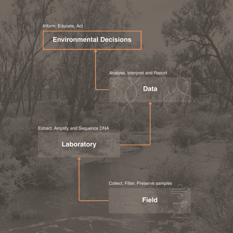 The eDNA process begins in the field, where samples are collected, filtered, and preserved. These samples are then taken to the laboratory to extract, amplify, and sequence DNA. The resulting data is analysed and interpreted to identify species and ecological patterns. This information informs environmental decisions, supporting conservation, monitoring, and evidence-based action.