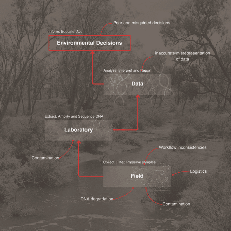 This diagram highlights vulnerable points across the eDNA workflow, from sample collection in the field, to laboratory processing, to data interpretation and ultimately environmental decision-making. At each stage, risks such as contamination, DNA degradation, logistical limitations, workflow inconsistencies, and misinterpretation of data can distort results. When these weaknesses compound, they can lead to inaccurate biodiversity information and poor environmental decisions. Strengthening reliability across the entire workflow is therefore critical to ensure that eDNA lives up to its potential as a trusted tool for ecological monitoring and conservation.