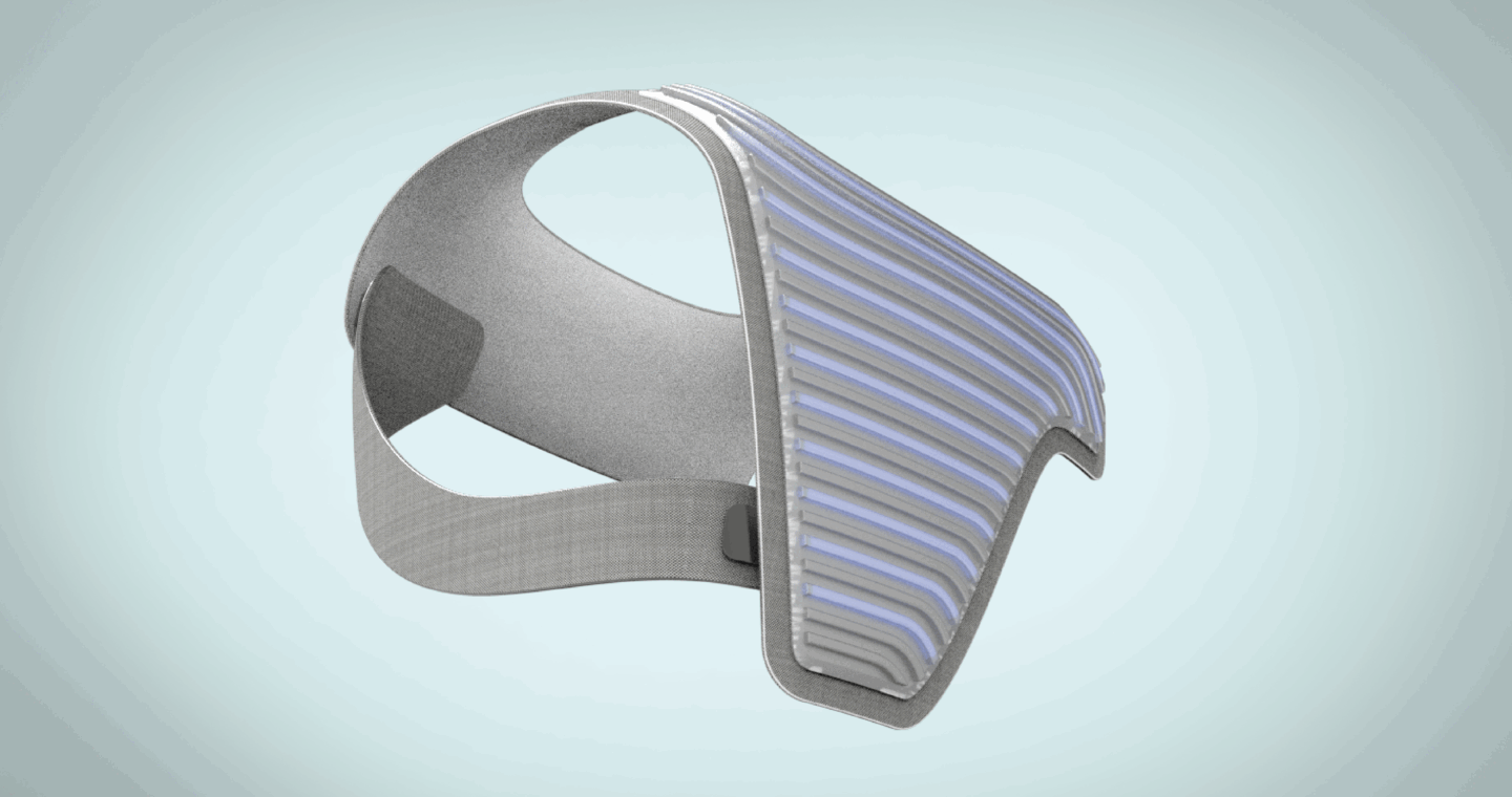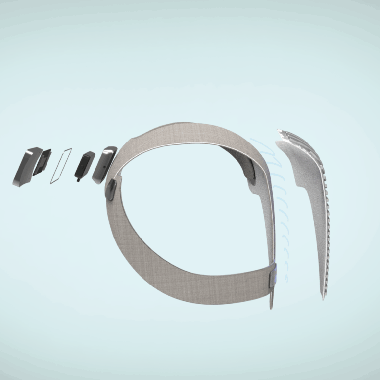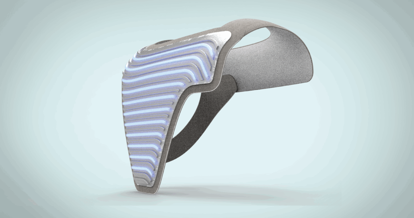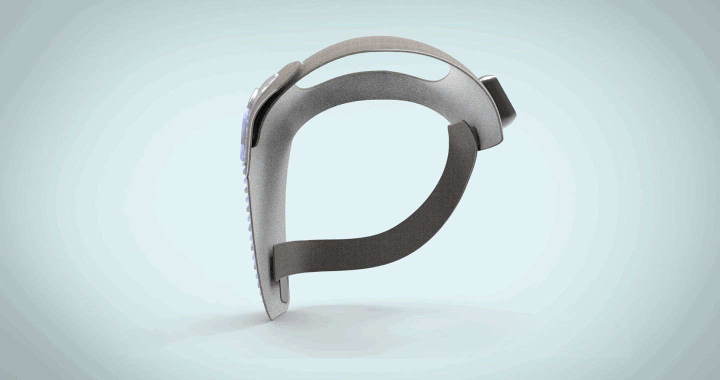 The construction of Helios is refined and understandable. The primary structure is comprised of a TPU-lined nylon fabric in a woven configuration, providing structural rigidity whilst communicating softness befitting the context. The physical interface is constructed from overmoulded semi-translucent silicone, bearing a unique texture to create interest and enhance physical pleasure upon touch, whilst the non-polar structure provides improved sterility and hydrophobic properties. An elasticised textile strap secures the front and rear sections in position, enhanced by embedded magnets to create a seamless and responsive attachment flow. Laid within the ridges of silicone texture, electroluminescent wiring combined with electrode receptors provide illuminative feedback using UV, which acts to constantly sterilise the translucent silicone section. A digital rear display, encapsulated by an ABS injection moulded shell, visualises health data from the receptors in an understandable, yet comprehensive manner to monitor real-time vital fluctuations and display them to carers.