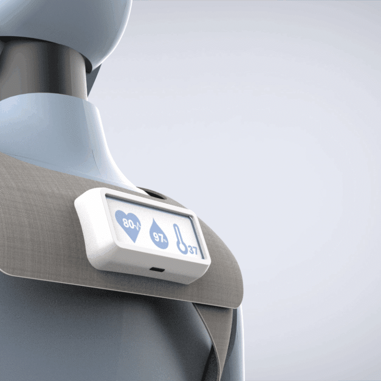 Located on the rear of the wearable, an incorporated display unit processes and presents real-time health information extracted from electrodes within the front interface. This display is designed to efficiently convey the status of in-home patients to their respective carers without the requirement for the carer to directly monitor the patient continuously. The screen is positioned at a slightly upright angle to improve the viewing experience from a stance behind the humanoid, improving functionality. Effectively, the device allows freedom for the carer to complete other tasks whilst maintaining observation over clients, assisting to resolve issues of understaffing. The measured vitals are presented in a readable fashion, encompassing a mixture of text and icon to improve information engagement within brief observations.