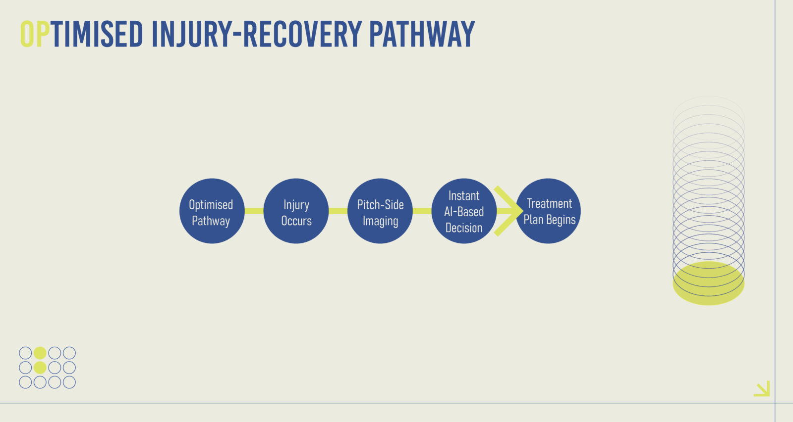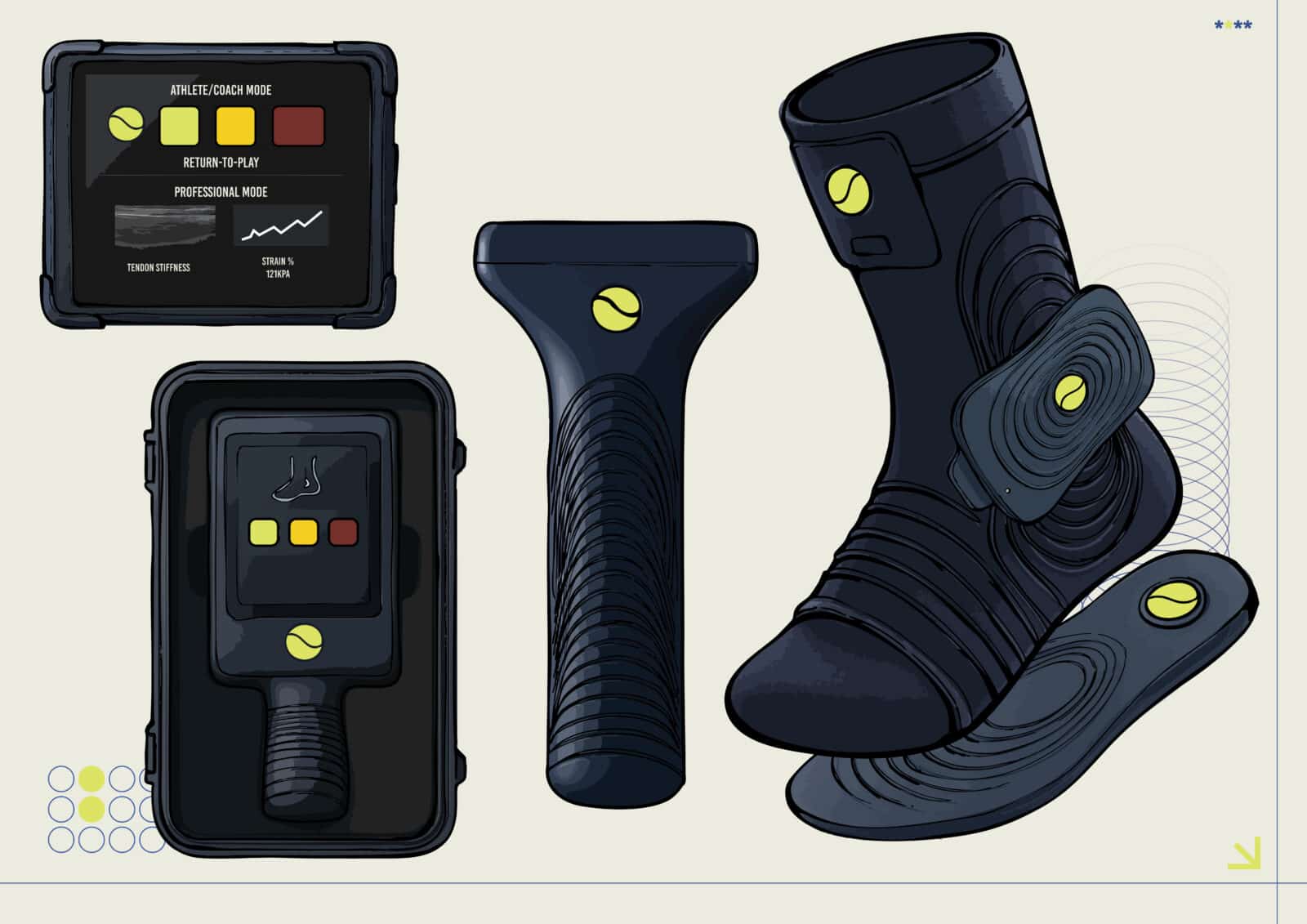 The colour palette was deliberately chosen to complement this visual language: navy blue for trust and technical depth, tennis-ball green for energy and performance, and bone white for clinical clarity. Together, these elements form a cohesive aesthetic that bridges sport and medicine, reflecting both functionality and familiarity within athletic environments.