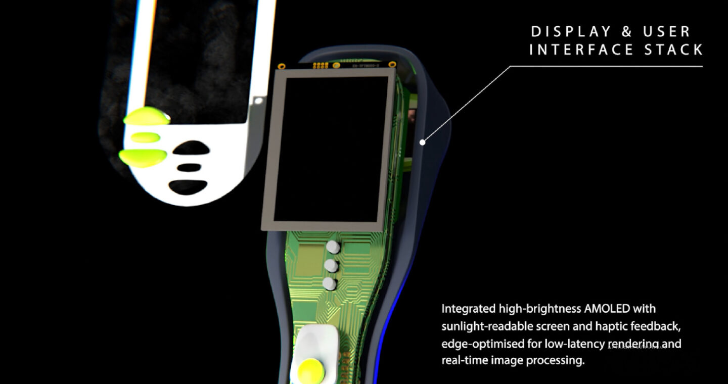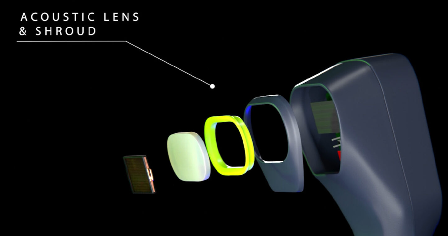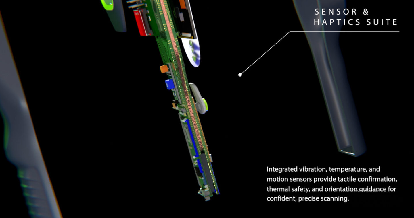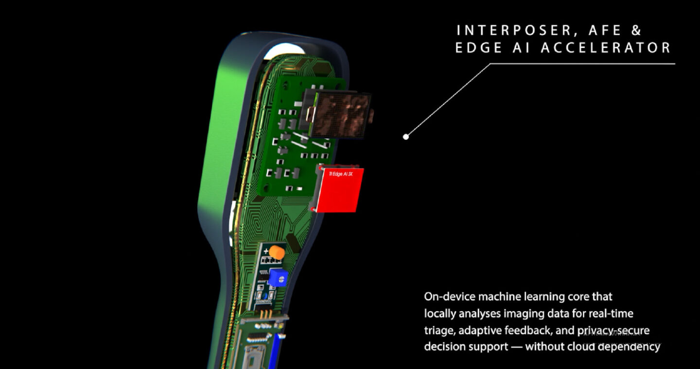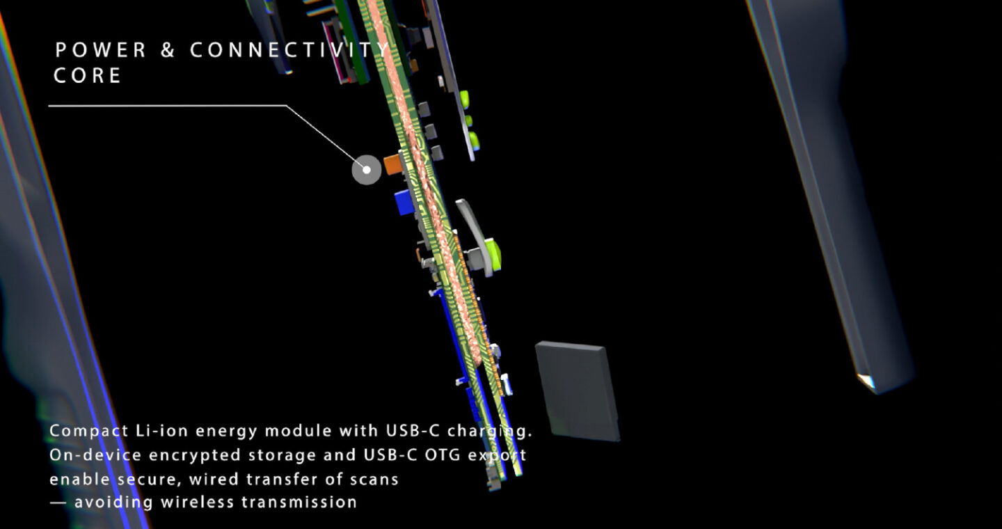 HOCUS POCUS is built around a stainless-steel internal frame, providing rigidity, impact resistance, and efficient heat dissipation for the edge-AI processor and transducer array. The linear ultrasound-on-chip system integrates signal processing directly within the probe, reducing noise and improving reliability.