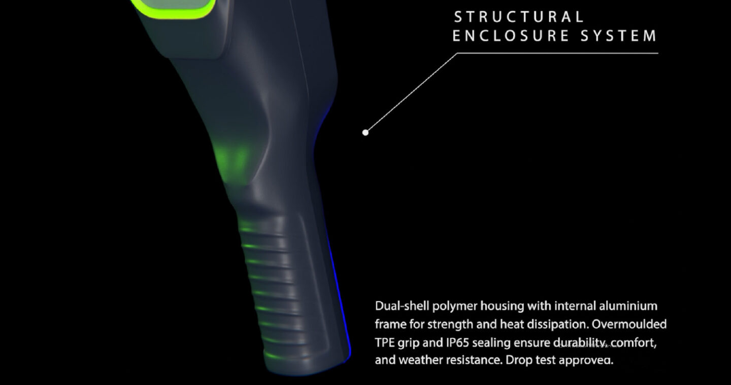 The exterior features a aluminium frame with overmoulded TPU for comfort, traction, and protection, sealed to an IP65 rating for outdoor durability. A magnesium-alloy rear plate acts as a passive heat sink and structural brace. All components are secured with standard fasteners, ensuring easy disassembly, repair, and long-term serviceability — combining professional performance with practical manufacturability.