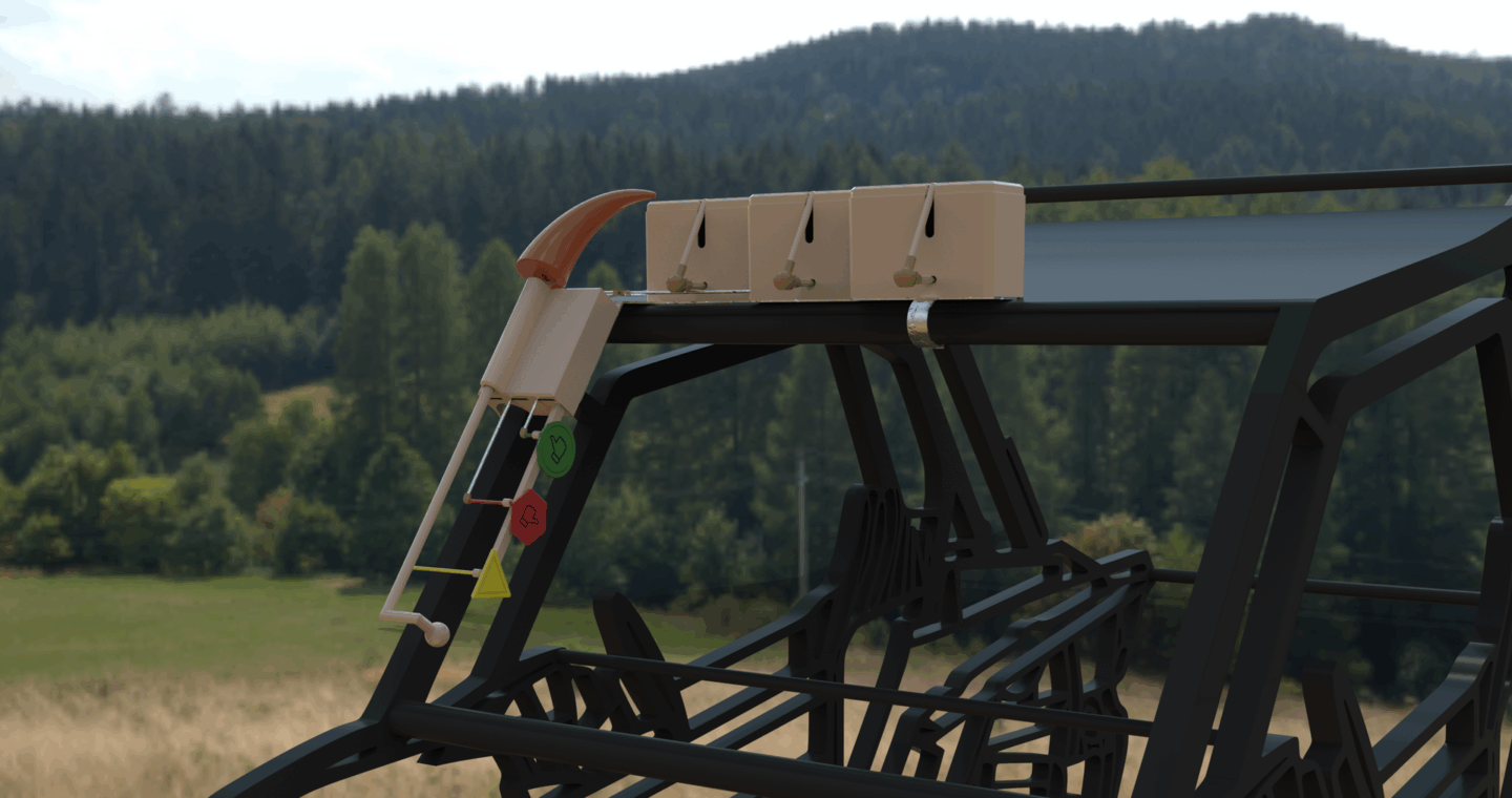 The horn-shaped indicator, located on the left side, adds a functional and cultural connection to the rural environment. It operates through a simple rotating handle that allows the user to signal direction or movement to others nearby. Together, these four components enable safe, intuitive, and independent communication, fostering inclusion, confidence, and connection during cattle mustering activities.