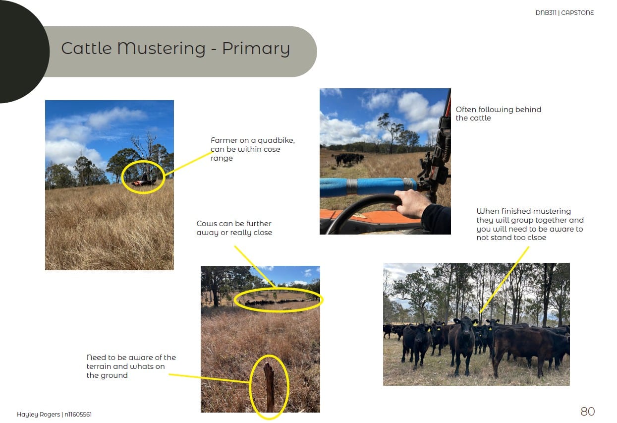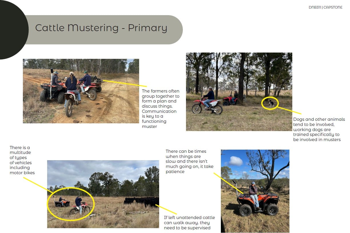 Observations of a live cattle muster revealed the complexity and physical demands of the activity. The constantly changing terrain—filled with rocks, tall grass, and uneven ground—requires caution, coordination, and strong communication among participants. Drivers must remain alert to avoid obstacles, control vehicles on unstable surfaces, and maintain awareness of other riders and livestock. Safety and teamwork are essential, as noise, isolation, and visibility challenges make communication difficult.