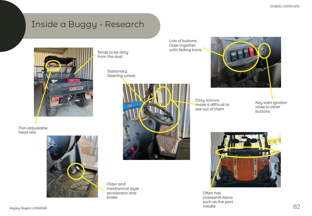 Research revealed a clear gap in the market for an adaptive device enabling children with Cerebral Palsy to safely and independently participate in cattle mustering. Key challenges identified include safety concerns, limited fine motor skills, reduced physical control, lack of comfort, difficulties with emotional regulation, and a desire for social connection. Addressing these through inclusive design can enhance safety, confidence, and enjoyment. Opportunities include safety features that alert users to risks, ergonomic controls for limited dexterity, sensory-friendly seating for comfort, and visual communication systems that foster connection. Collectively, these solutions promote independence, emotional stability, and participation in meaningful outdoor family activities.