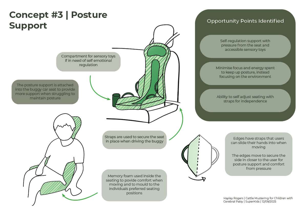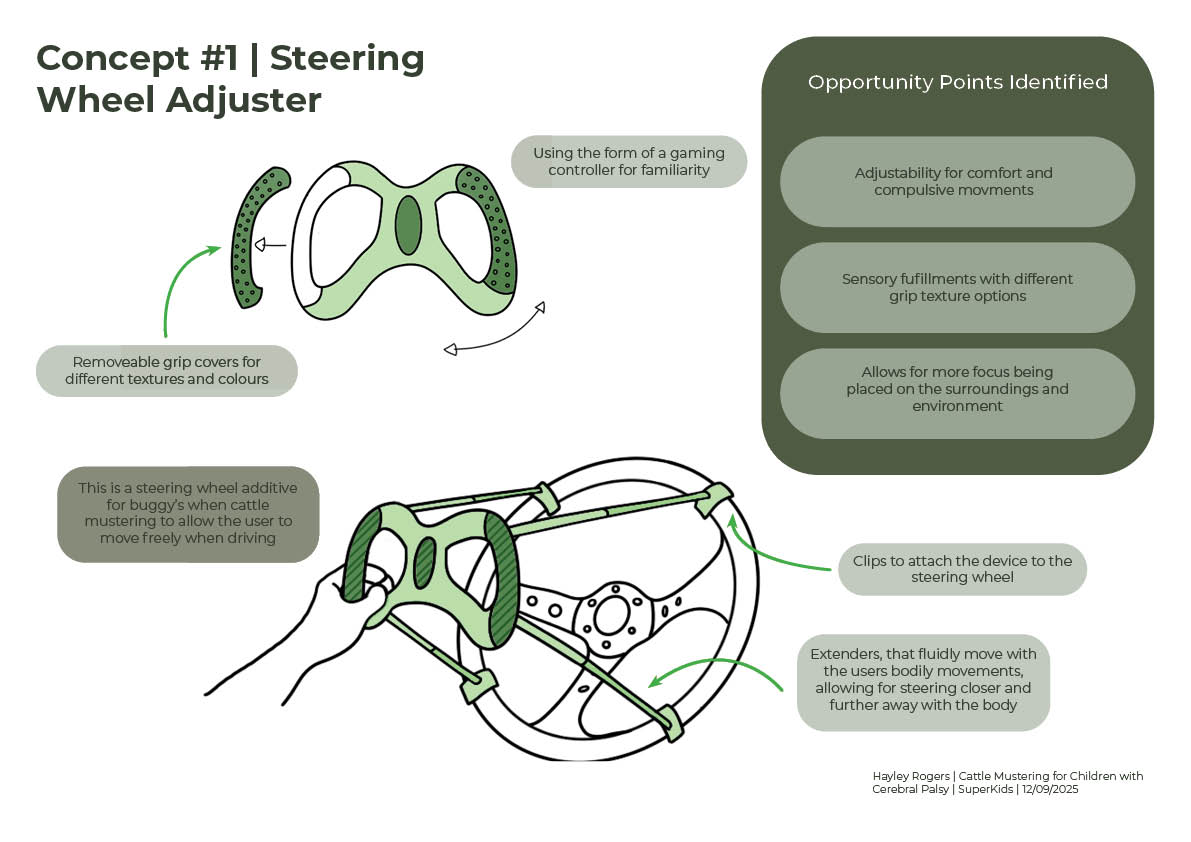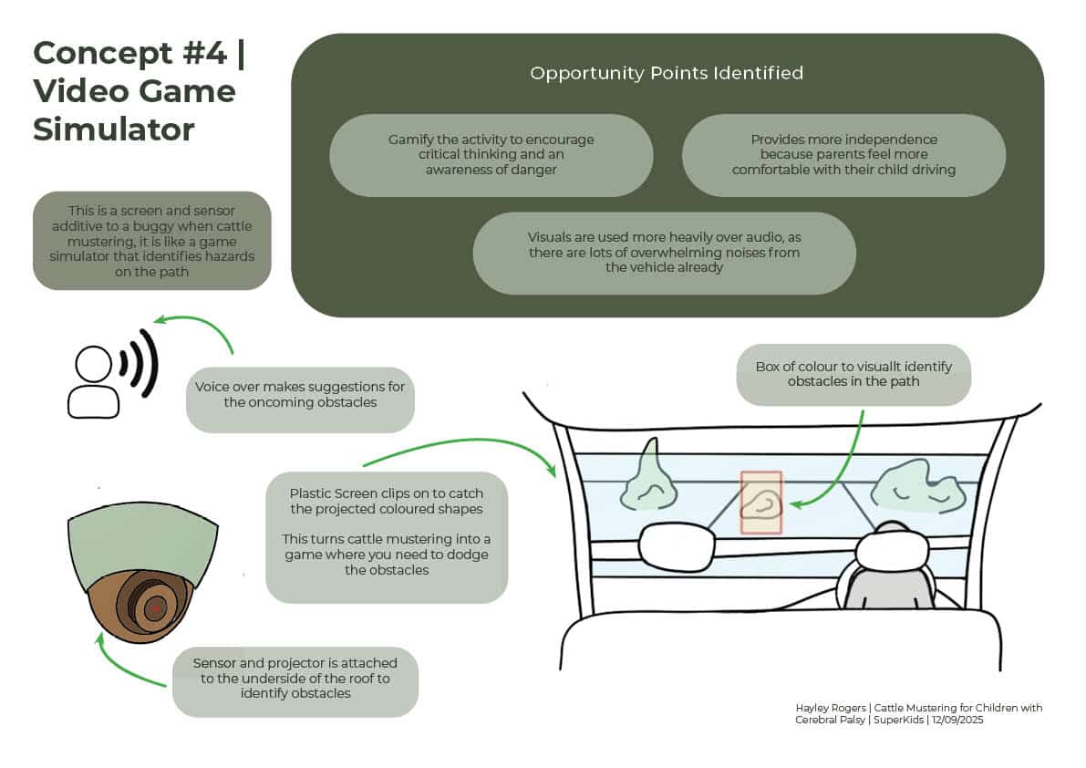 Cerebral Palsy refers to a group of disorders that primarily affect muscle movement, posture, coordination, and communication abilities. These challenges make multitasking, fine motor control, and emotional regulation particularly difficult, especially in physically demanding activities like cattle mustering. Mustering requires coordination, quick responses, and communication between riders—tasks that can be overwhelming for children with Cerebral Palsy. However, recreational activities like this play a vital role in a child’s development, providing opportunities for joy, confidence, and social connection. The research revealed a need to bridge the gap between a child’s desire for participation and the physical limitations imposed by their disability, highlighting the importance of inclusive design that supports independence, safety, and fun.