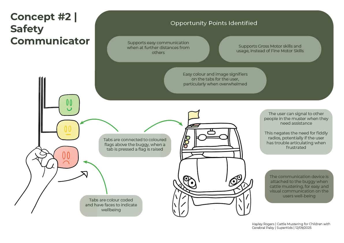 Mustering Mate is an analog communication device designed to help children with Cerebral Palsy safely and independently participate in cattle mustering. Mounted on a buggy, it uses large tactile buttons and visual signals to replace traditional radios, enabling clear, accessible communication between riders while promoting inclusion, safety, and confidence.