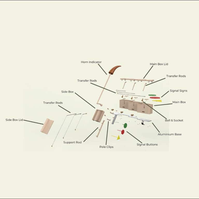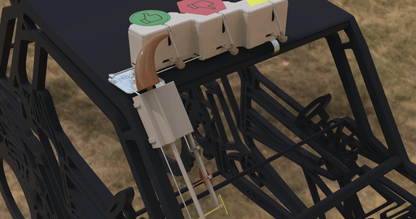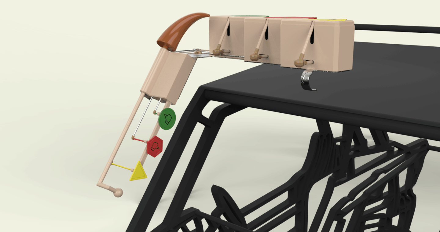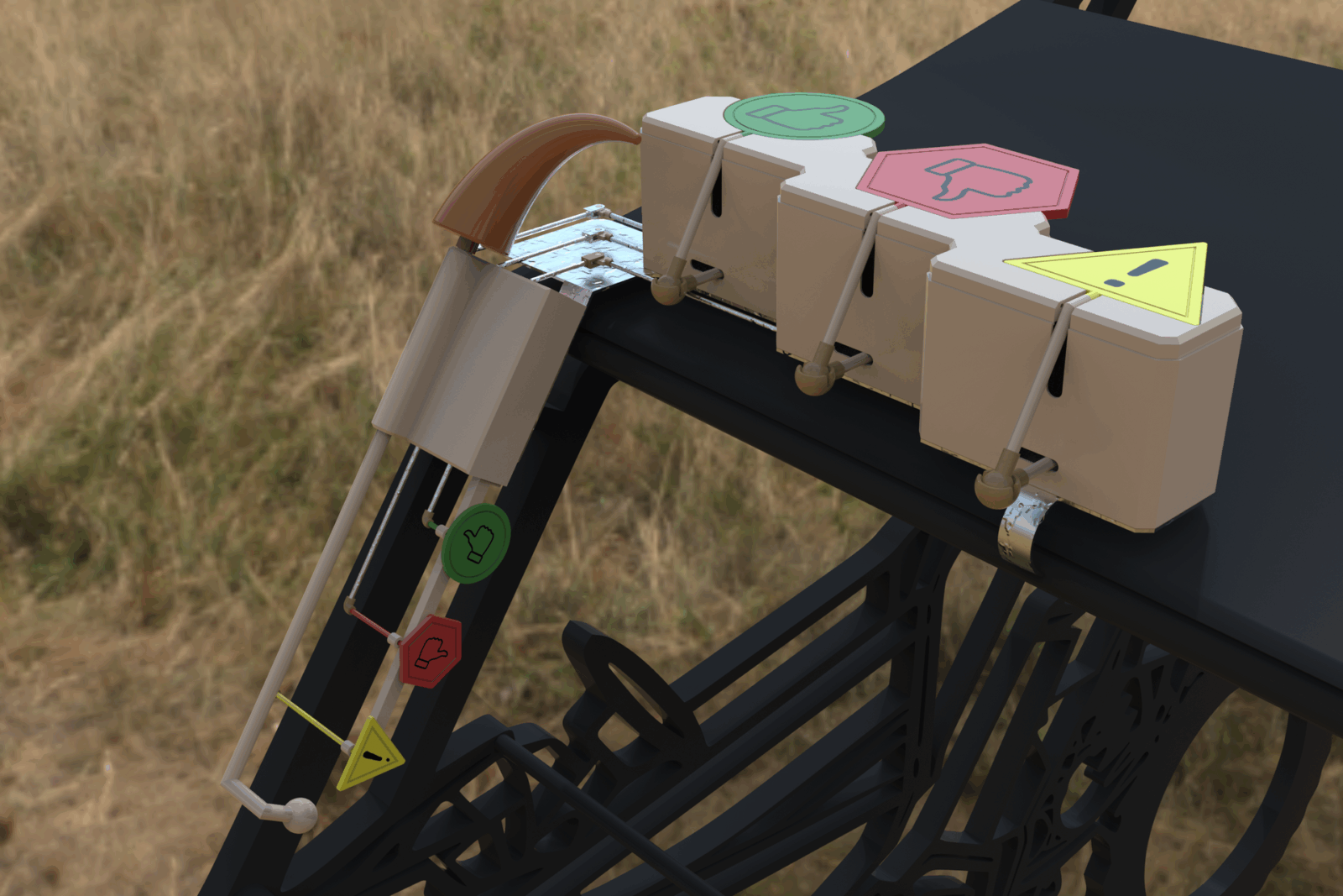 The horn-shaped indicator, located on the left side, adds a functional and cultural connection to the rural environment. It operates through a simple rotating handle that allows the user to signal direction or movement to others nearby. Together, these four components enable safe, intuitive, and independent communication, fostering inclusion, confidence, and connection during cattle mustering activities.