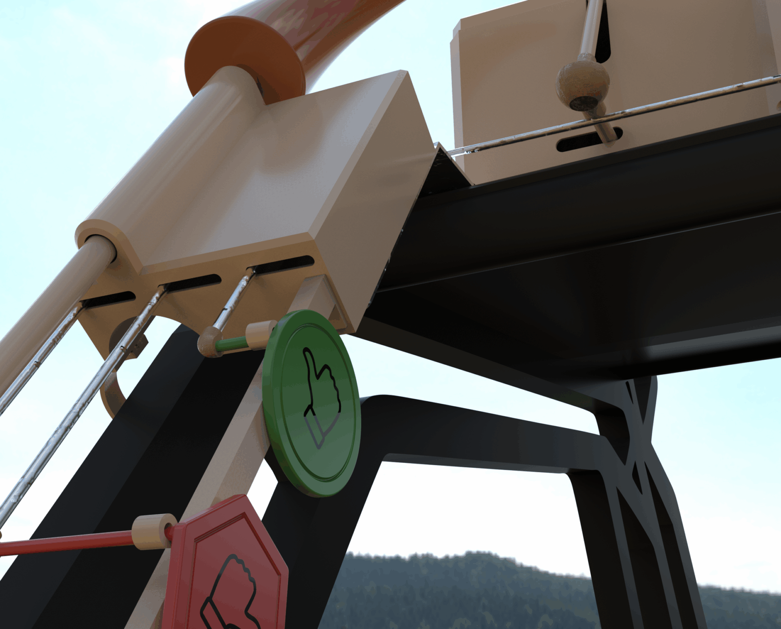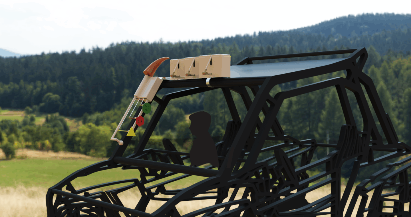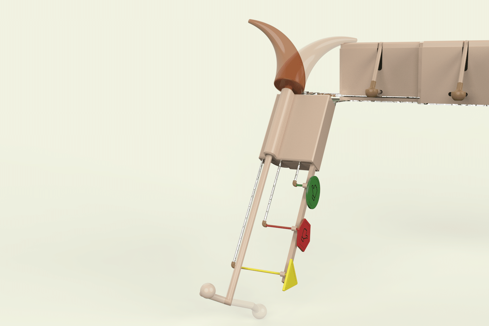 The horn-shaped indicator, located on the left side, adds a functional and cultural connection to the rural environment. It operates through a simple rotating handle that allows the user to signal direction or movement to others nearby. Together, these four components enable safe, intuitive, and independent communication, fostering inclusion, confidence, and connection during cattle mustering activities.