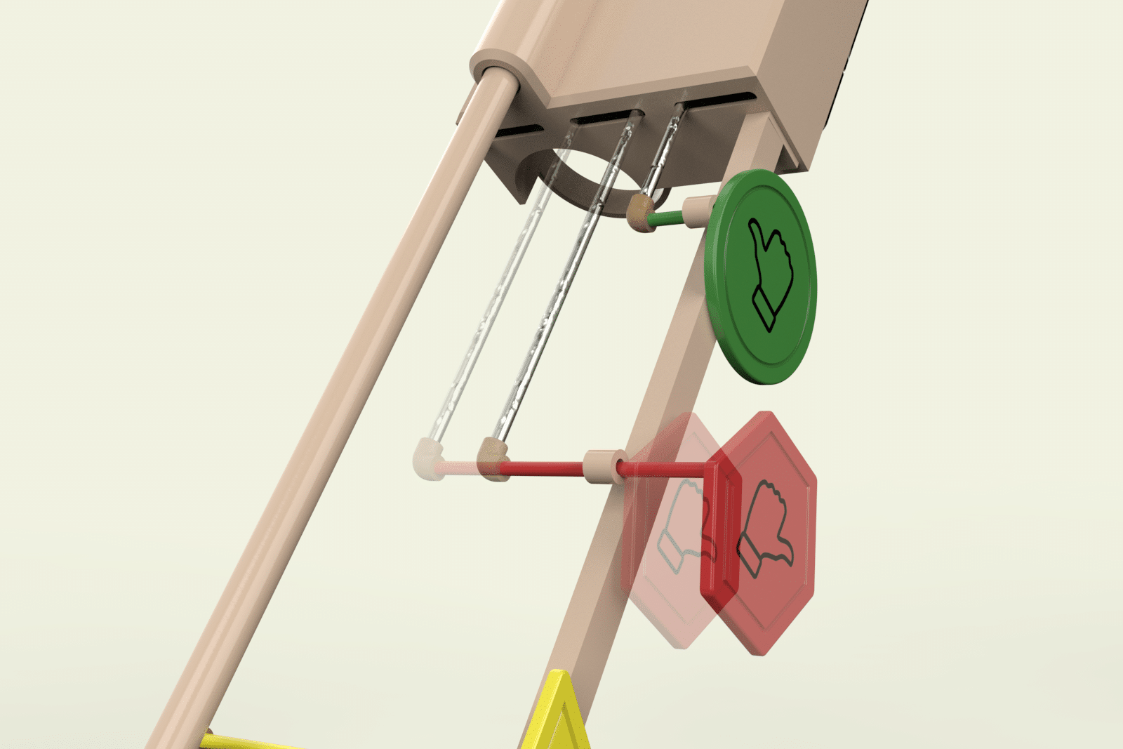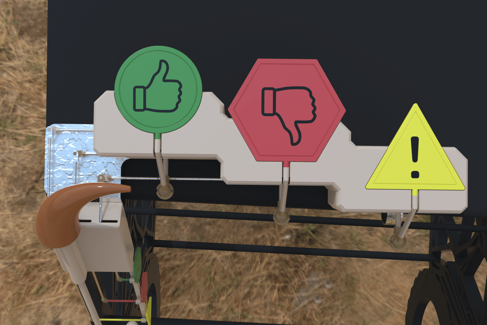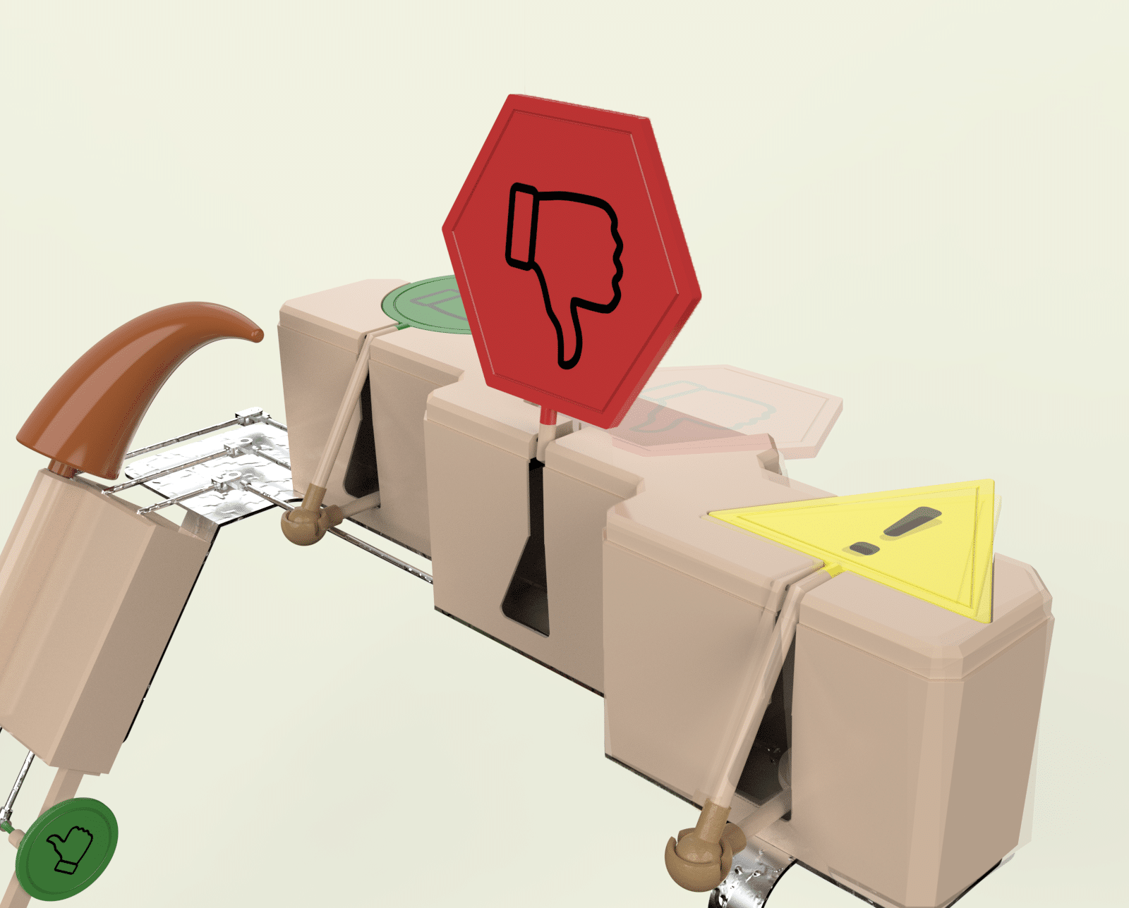 The three visual signs are mounted on the top of the device and serve as clear, universally understood signals. The green circular sign represents confirmation or acknowledgment, allowing the user to indicate they have received a message or instruction. The red hexagonal sign functions as a distress signal, alerting others when help is needed or the user is in difficulty. The yellow triangular sign acts as a warning to communicate potential hazards, obstacles, or road issues ahead. These signs are activated using large tactile buttons on the side, designed for ease of use and minimal precision.