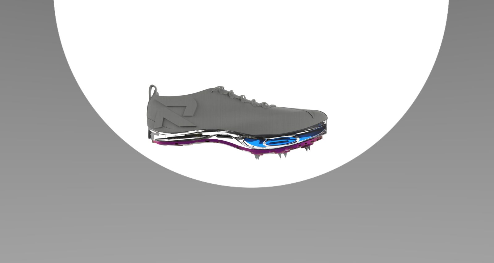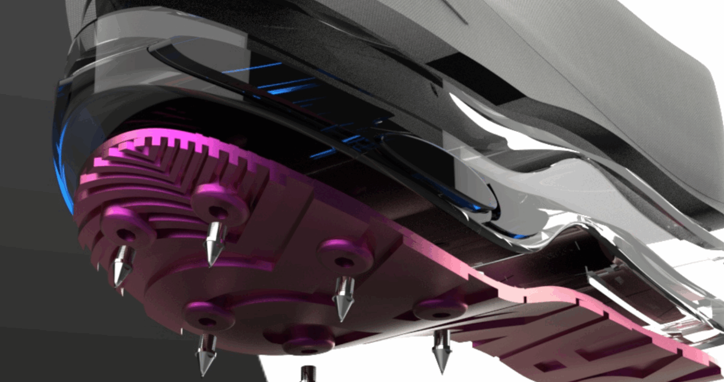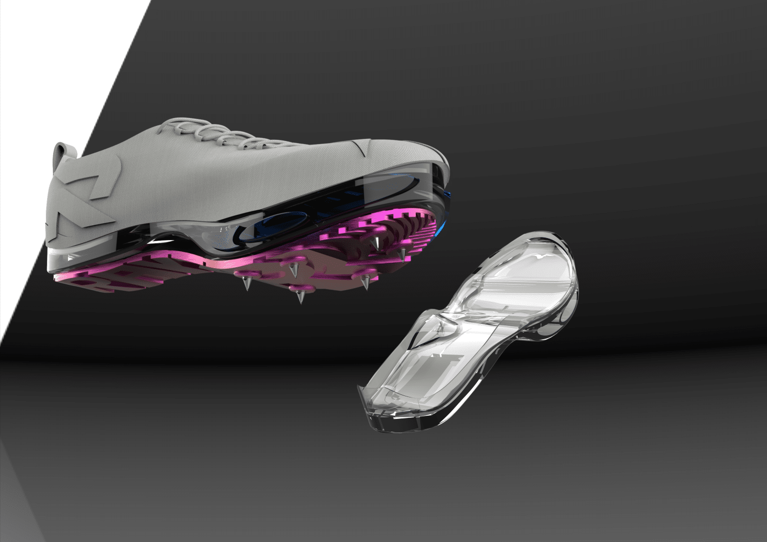 The result came to a design that embodies both performance and aesthetic appeal. The clear base highlights the internal electronics, creating a visually dynamic and high tech look. The combination of white, bright blue, and pink forms a striking contrast that remains feminine yet athletic. The bubble element protects the battery from impact while adding visual appeal and performance benefits, while the arch gap reinforces the perception of agility and speed. Finally, the logo is integrated onto the base spike plate, serving as both a distinctive visual feature and a functional texture that enhances traction during sprinting.