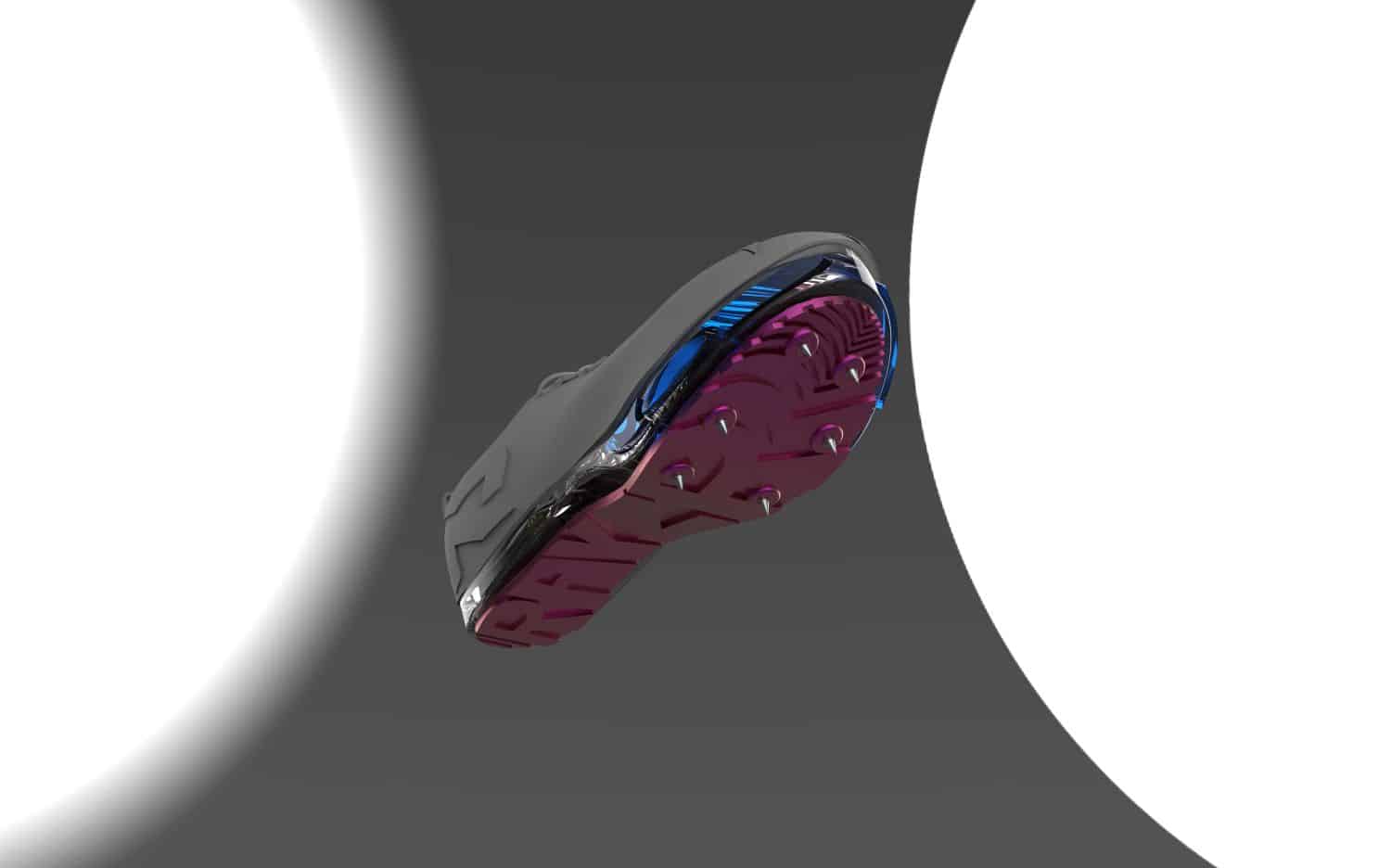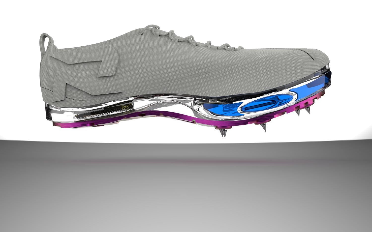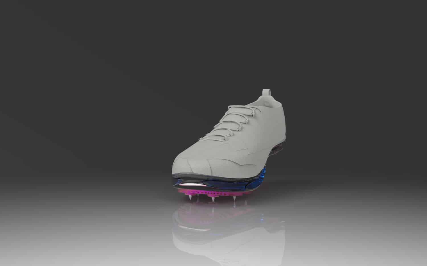 The result came to a design that embodies both performance and aesthetic appeal. The clear base highlights the internal electronics, creating a visually dynamic and high tech look. The combination of white, bright blue, and pink forms a striking contrast that remains feminine yet athletic. The bubble element protects the battery from impact while adding visual appeal and performance benefits, while the arch gap reinforces the perception of agility and speed. Finally, the logo is integrated onto the base spike plate, serving as both a distinctive visual feature and a functional texture that enhances traction during sprinting.
