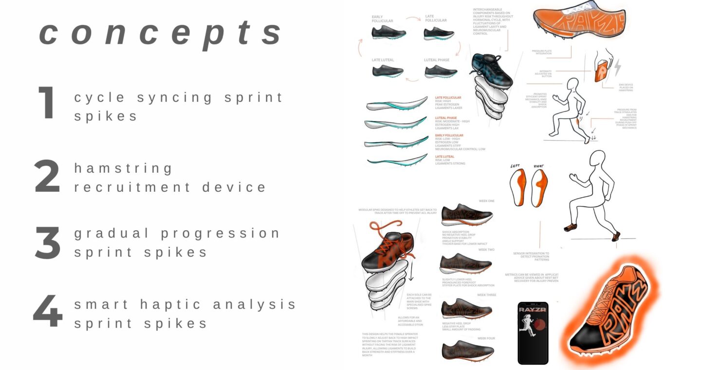 I set out to find solutions to address these issues, exploring muscular activation devices, adaptive shoe wear and analysis technology, and it seemed that the fourth concept had the potential to be the most effective in the prevention of ACL injury in female sprint athletes, a female-specific sprint spike that improves body awareness, mechanical efficiency, and fatigue management through smart haptic feedback systems.