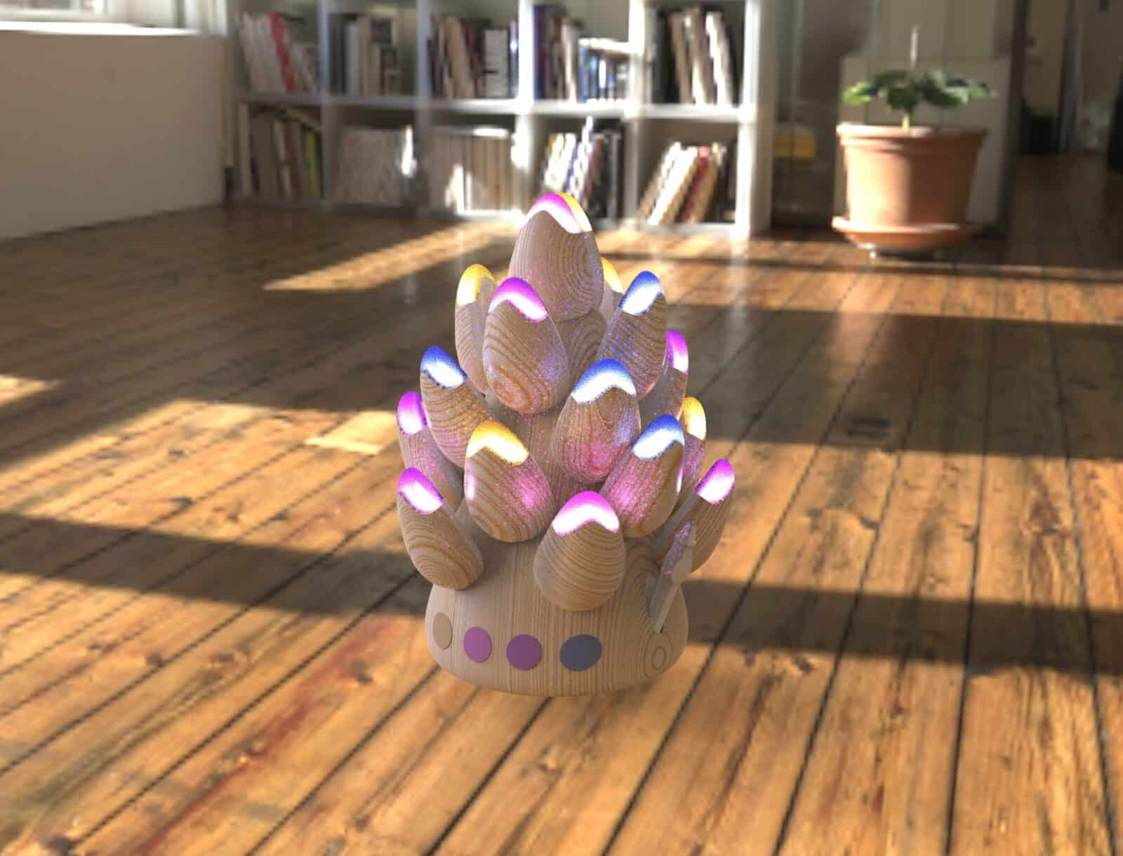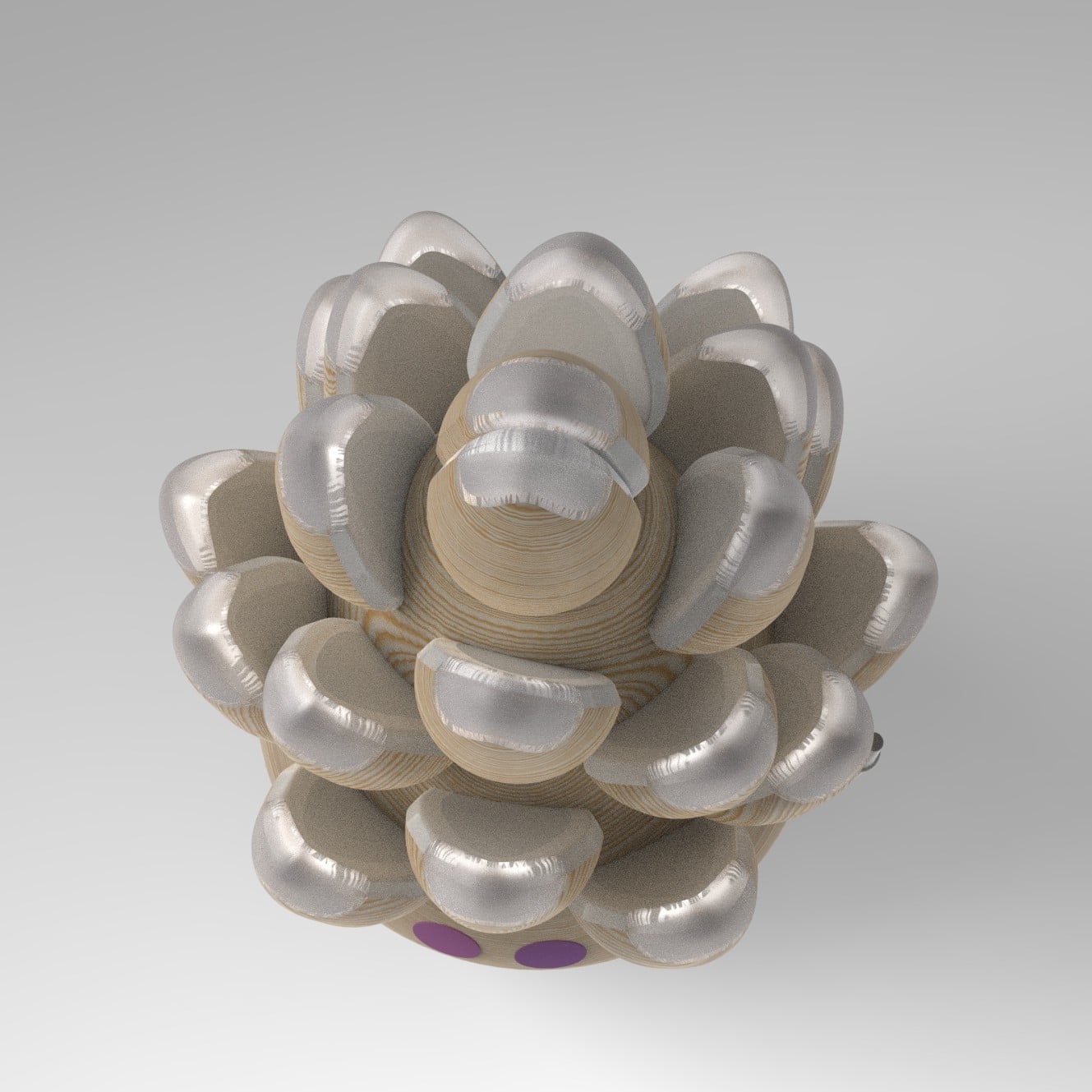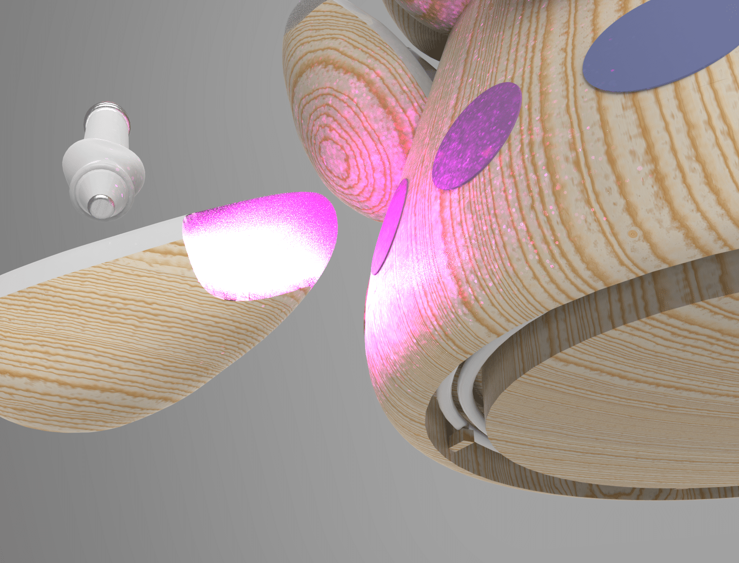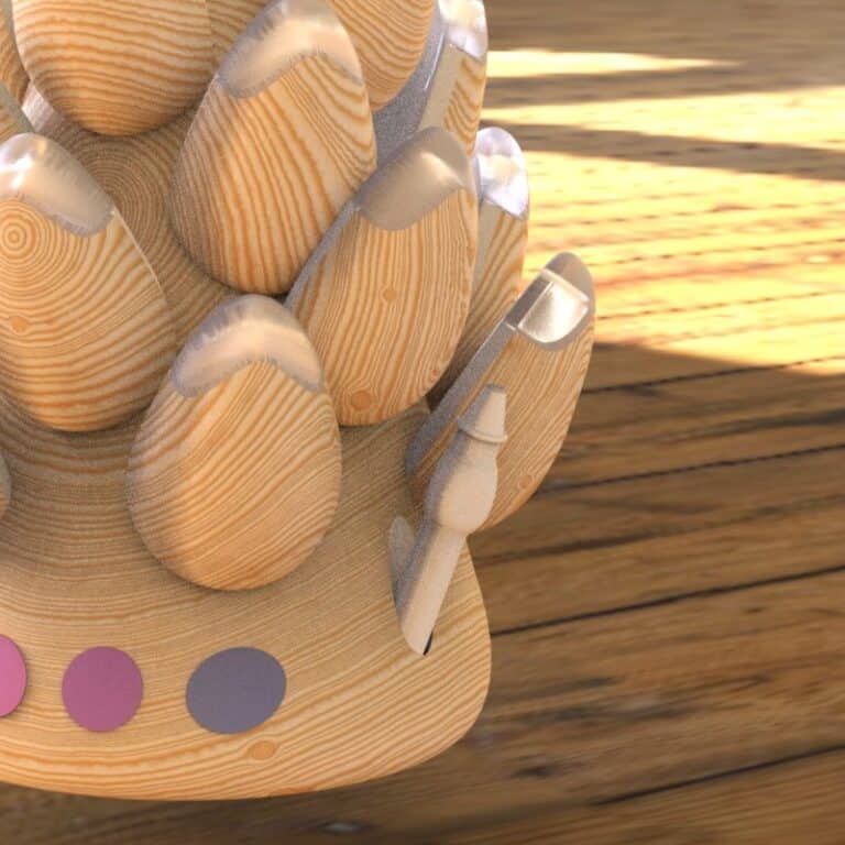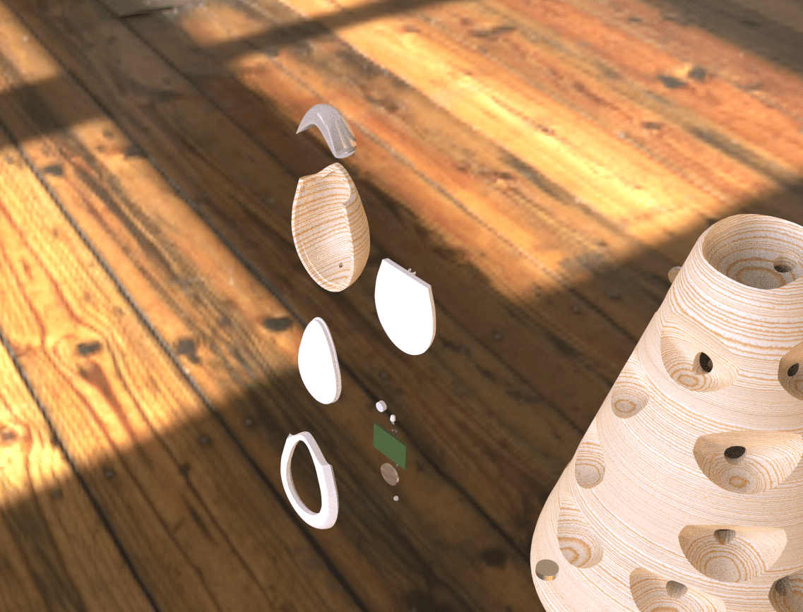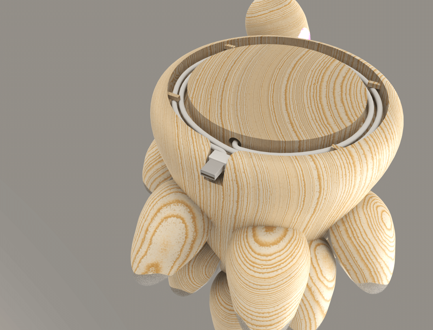 The base of SaplingCare is hollow, made from pine wood with CNC machined groves/ slots within the lathed form.