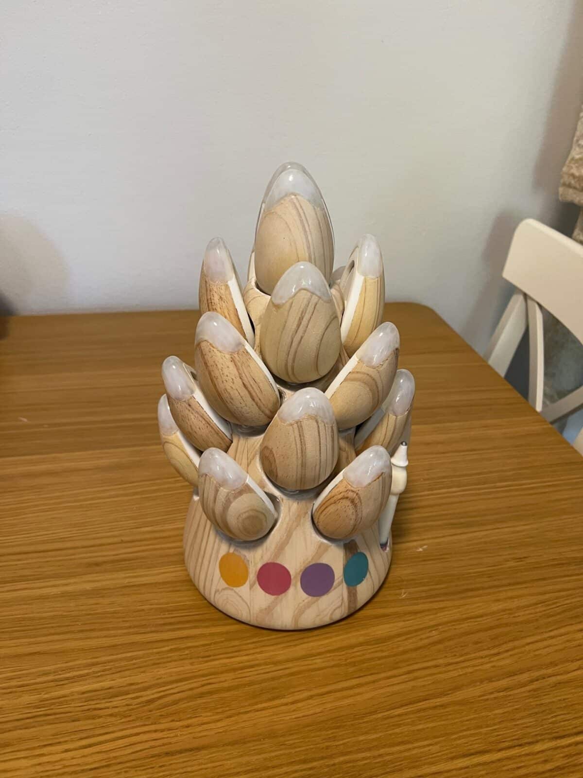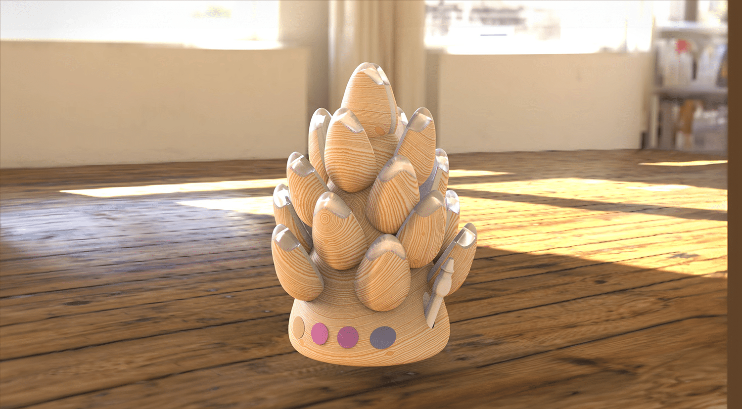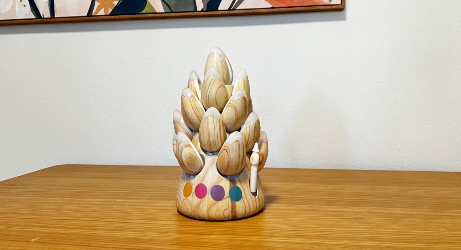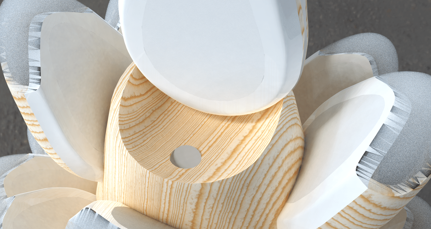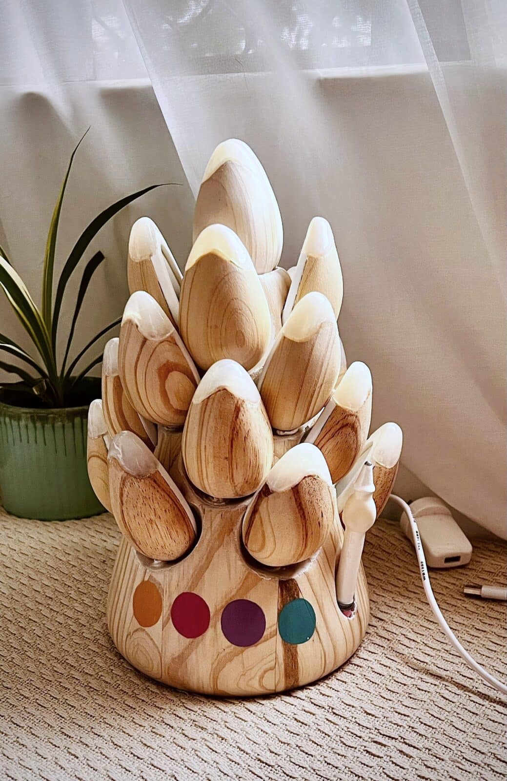 The base of SaplingCare is hollow, made from pine wood with CNC machined groves/ slots within the lathed form.