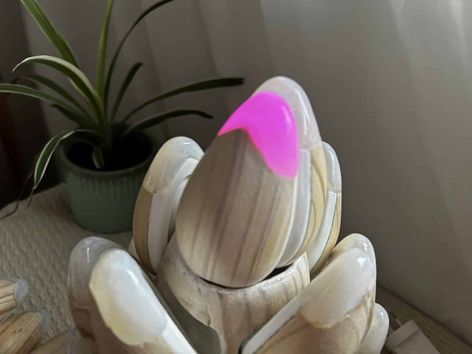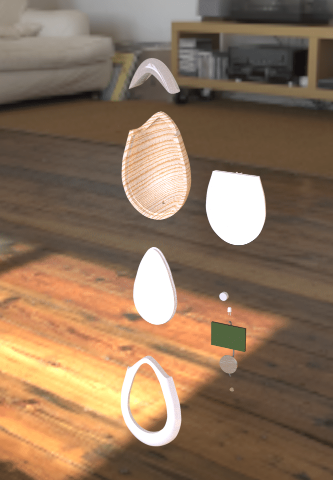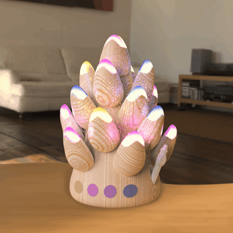 The leaves have a back base of pine wood, with injection molded PET front and top parts. This allows for the LED to shine through the top semi-transparent plastic when displaying colour.