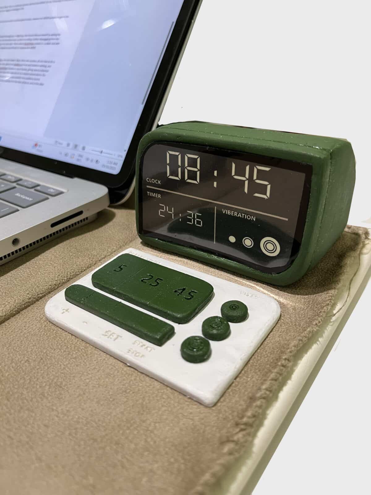 StudyVibes incorporates a number of aesthetic design principles. Unity has been created, bringing the main body of the design, LCD timer/ clock body and interface, and button layout together through continuity of the leaf-like shape. This creates a sense of calm. Through applying scale and alignment to each element of the product, a streamline affect has been achieved. The consistent combination of curved lines paired with sharp corners create definition, elevating the product’s aesthetic. A simple colour palette of taupe, green, and white make the StudyVibes appealing to a wide range of people, incorporating both bright and neutral tones.