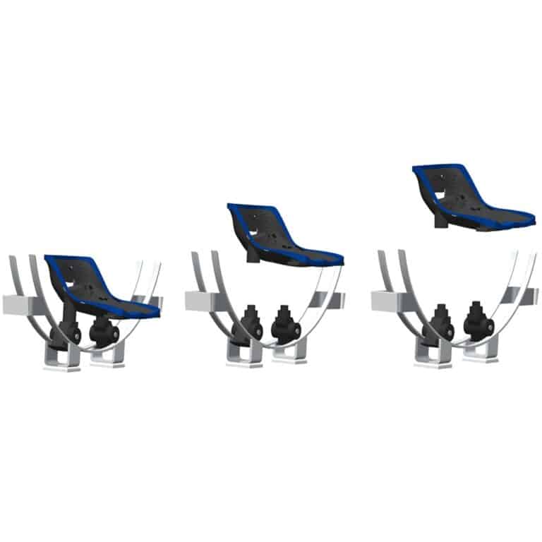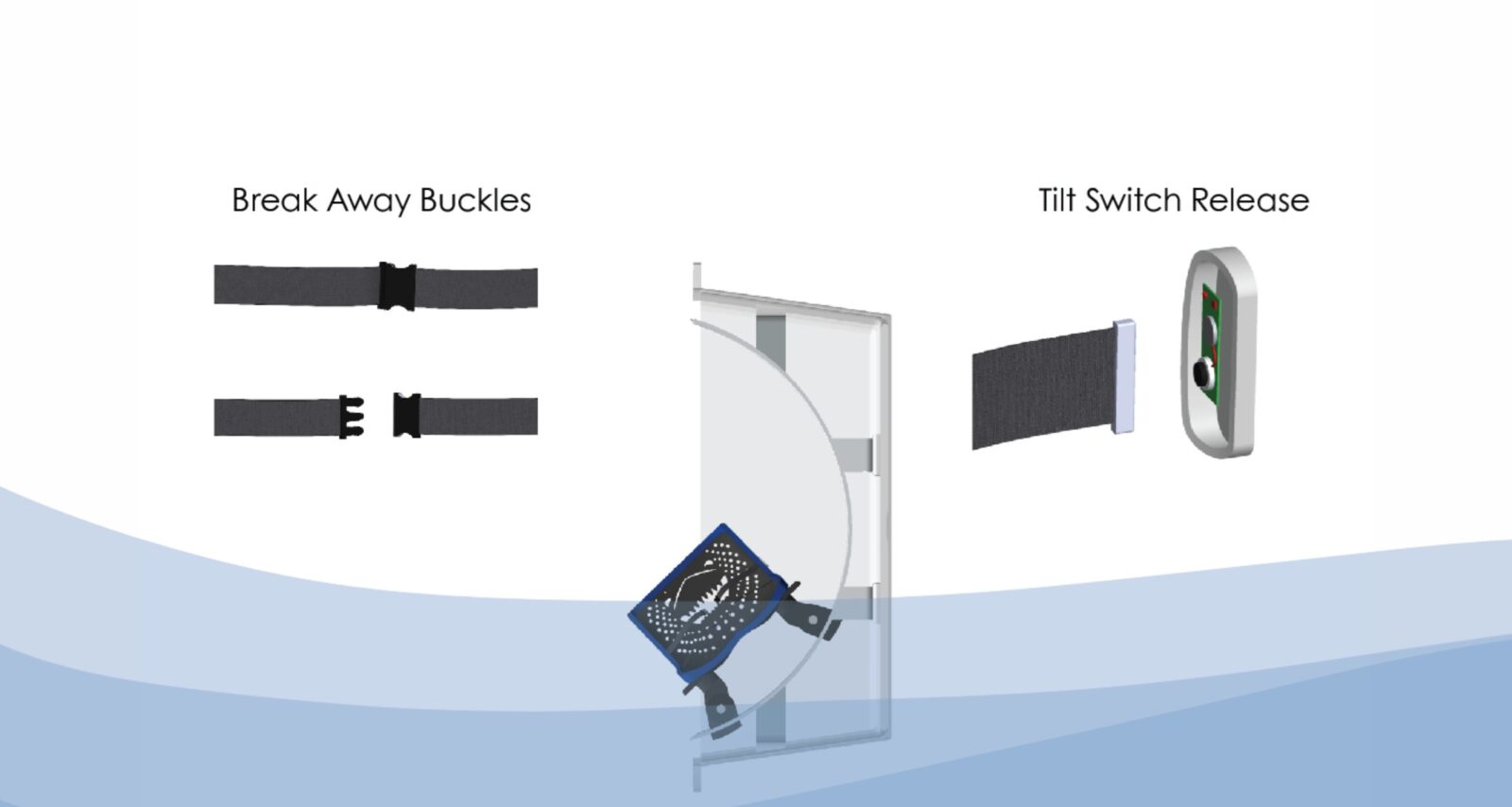 There are two fail-safes to ensure the user is released from the boat in a capsize in the event that the chair does not leave the rail system: breakaway buckles to the lap straps of the seat and a 60-degree tilt switch release for the straps.
