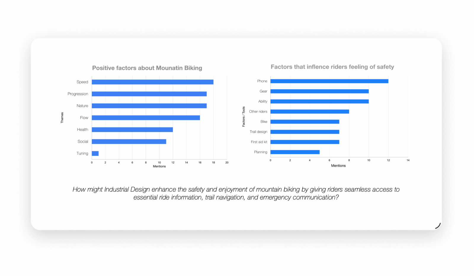 Research into mountain biking safety and rider behaviour revealed that over 70% of surveyed riders rely on their mobile phones for navigation, data tracking, and communication while riding. This can often lead to distraction, accessibility issues, and increased risk in emergencies. Studies and surveys highlighted a clear lack of integrated technology designed specifically for off-road cycling environments, where network coverage and response times can be unreliable. These findings emphasised the need for a dedicated, on-bar system that keeps riders informed, connected, and safe without compromising focus or control on the trail.